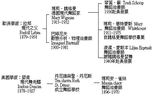 表一:下列简图列出早期舞蹈治疗师的舞蹈渊源